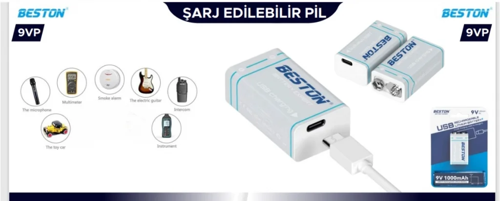 Beston Pil 9Vp Şarj Edilebilir 9V 1000Mah Usb Type-C Şarj Kablolu
