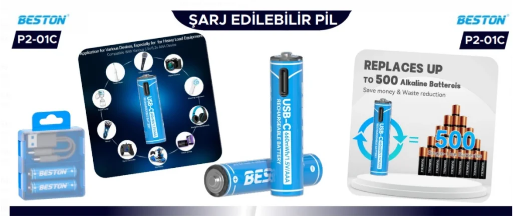 Beston Pil P2-01C Şarj Edilebilir 2'Li 1.5V Aaa Usb Type-C Şarj Kablolu