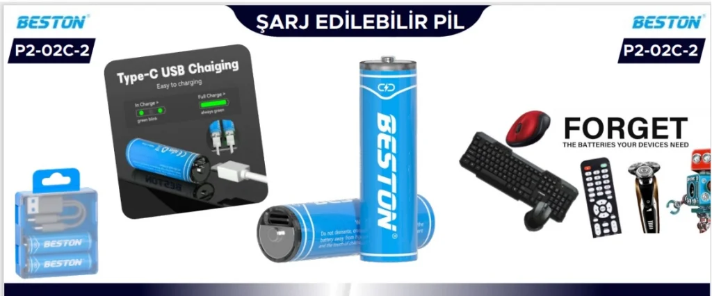 Beston Pil P2-02C-2 Şarj Edilebilir 2'Li 1.5V Aaa Usb Type-C Şarj Kablolu
